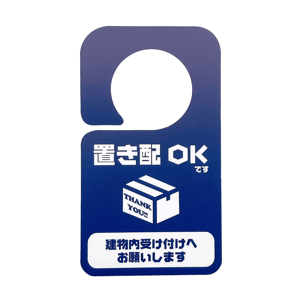 不在時の再配達を防止するドアプレートです。玄関ドアに引っ掛けるだけで『置き配OK』と伝えることができます。不在時はもちろん、在宅時でも 手が離せないから出られない、 ウイルス対策のため対面接触を避けたい、リモートワークでのWEB会議中に邪魔されたくない、子供のお昼寝中静かにしてほしい、スッピンで出られない、ウーバーイーツなどのフードデリバリーや宅配ボックスに入れてもらいたいときなど様々なシチュエーションで活躍します。また宅配業者の再配達問題も解決でき、盗難やトラブル防止にも役立ちます。 プレートは防水・撥水に優れるため、雨の日など天候の悪い日に掛けておいても問題ありません。日焼けによる色あせ・傷や汚れにも強く丈夫で長持ちします。軽量ですがしなやかで耐久性抜群。3年〜5年は安心してお使いいただけます。また丸みの直径を大きく設計したので、どんなドアノブにも合わせることができます。ステッカーやシールのように一度きりでなく何年も使用できるため、多くの方に反響の声を頂いている商品です。
