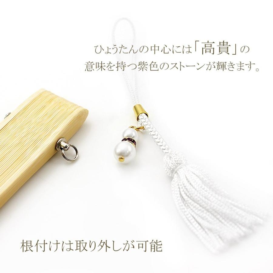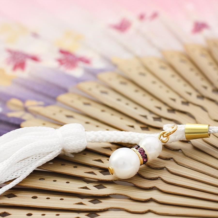 持ち手の部分には、真珠でデザインされた瓢箪の根付けと白い房が付いています♪