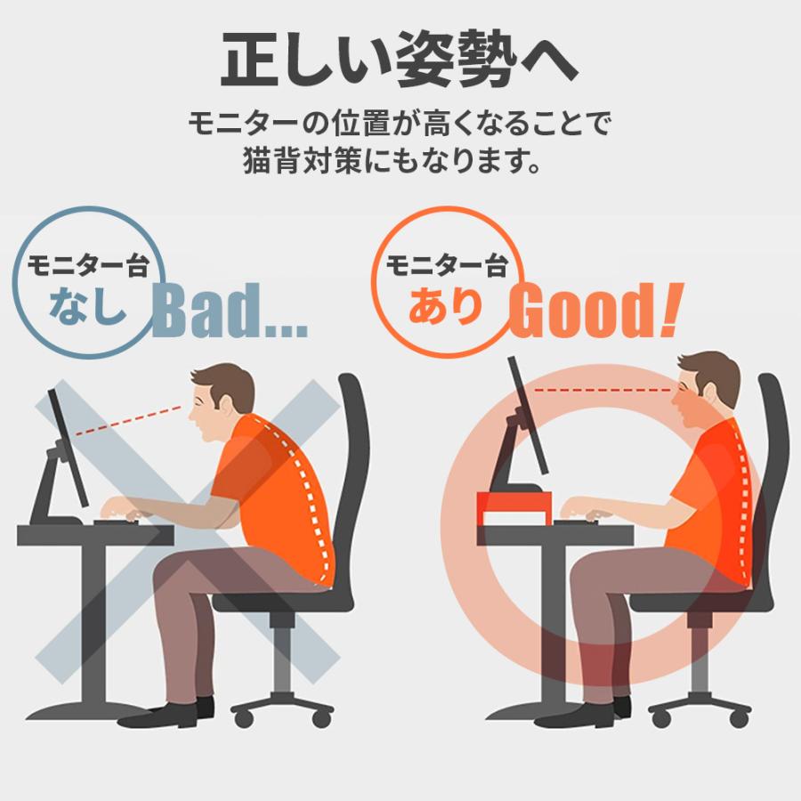 モニターの高さが上がると目線も上がり姿勢も正されやすくなるので肩こりや疲労を軽減。