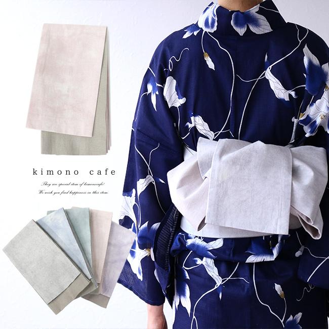 手染めの麻の半巾帯です。自然で上品なムラ染めに仕上がる【箱むらくも絞り】で細帯にすれば、着物や浴衣の邪魔はしないんだけれど、すごく存在感のある名脇役的な帯ができあがるんじゃないかな、と思って作りました。染料が染みる具合によってできる自然なムラはどこをとっても同じ模様の部分はなく、奥行きのあるとても上品な仕上がりになりました。両面使えるように裏も麻生地にし、使いやすいグレイッシュブラウンに染めています。両面ともに麻なので通気性がよく、暑い季節にすっきりとしたコーデを楽しみたい時に重宝します。麻帯のデメリットはシワになりやすい、という点ですが、この帯はムラの陰影がシワを目立たなくしてくれるという何とも優れものな帯でもあります。ぜひ、カジュアルだけどカジュアル過ぎない大人半幅帯として、この帯を楽しんでくださいね!