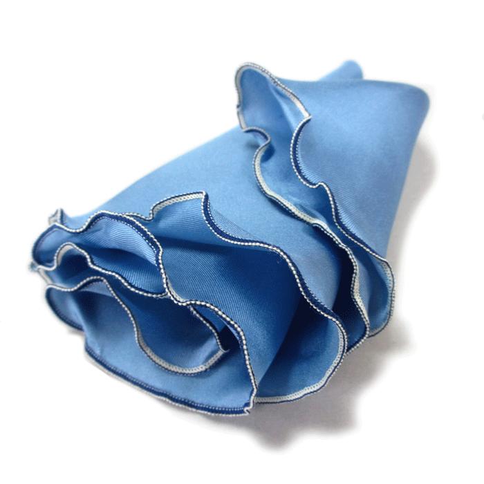 フチ糸を2色使った当店オリジナルの縫製技術が繊細でおしゃれです。単純なシングルのラウンドチーフと比べればその差は歴然。フチを出さずに使えば普通のチーフとしても使用できます。TOKIチーフ最多の18色展開になります。サイズ:直径約28cm品質:日本製(横浜自社製)シルク100% カラ―:スカイブルー(巻糸カラー:ネイビー/クリーム)TPO:オールラウンドに対応 ※プレゼント用にも 使えるオリジナルパッケージはチーフ1枚ごとに付属します(3枚の場合は3パッケージ付属)