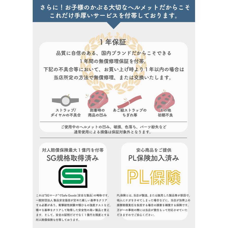 安心の1年保証つき!品質に自信のある国内ブランドだからできる安心制度!大事なお子さまを守る大切なヘルメット。