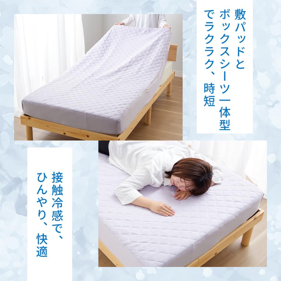 ■品質/表側・マチ:ナイロン、裏側・中わた:ポリエステル■サイズ(cm)約/クイーン:160×200×30■機能/接触冷感(表地)・抗菌防臭(中わた)■取扱い/洗濯機洗いOK(ネット使用)ひんやり接触冷感敷パッドとボックスシーツが一体型なので、家事がラクちん&時短にも!ずれにくく、寝ているときも元気なお子様にもオススメ。接触冷感機能付なので寝返りをするたびにひんやり気持ちいい※画像はご覧のモニターやパソコン等により実際と多少色合いが異なって見える場合がございます。