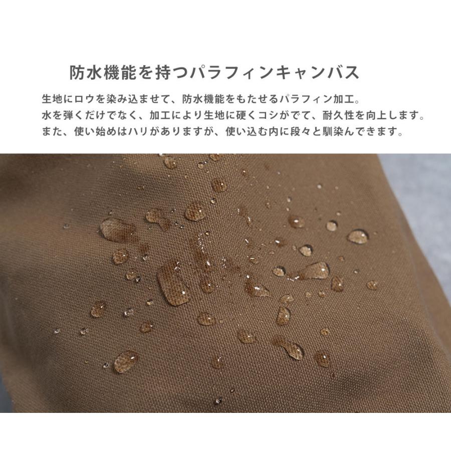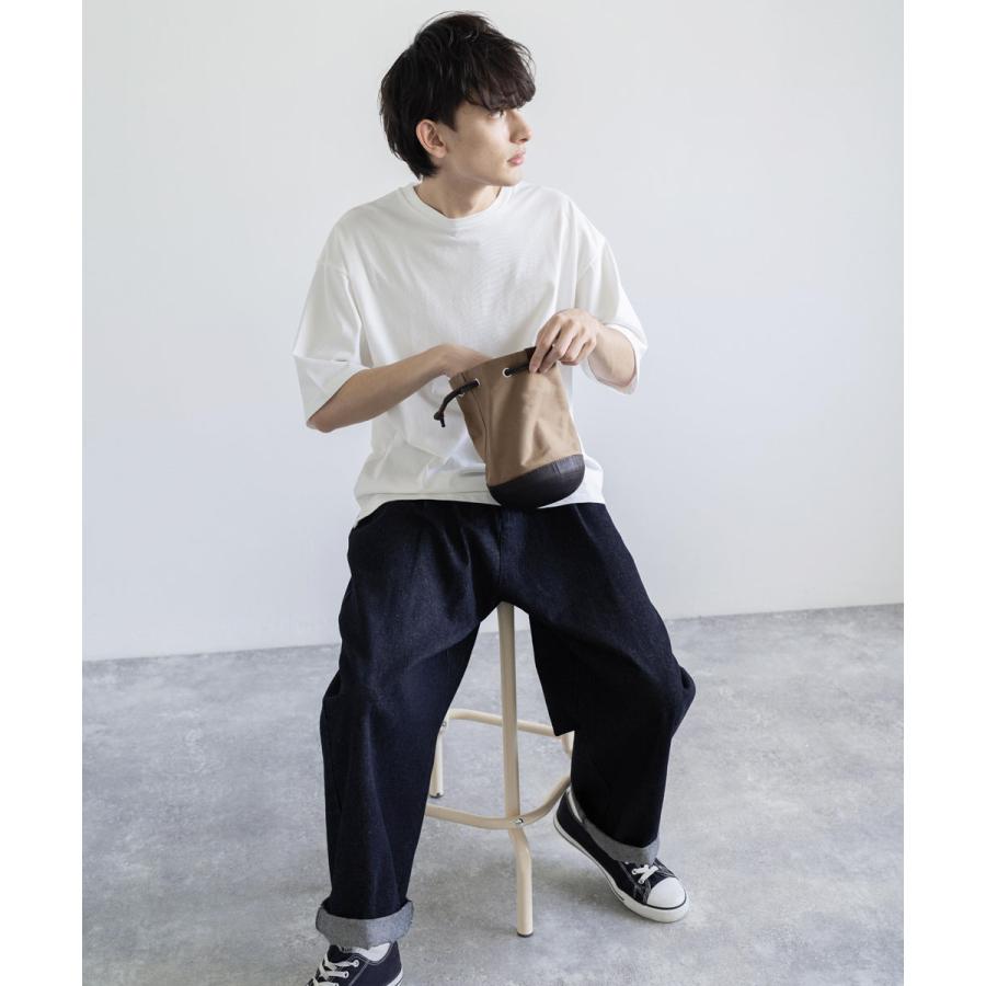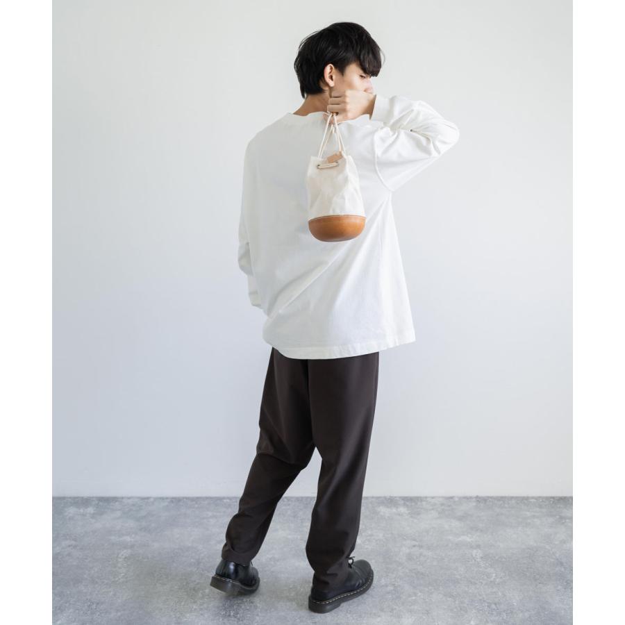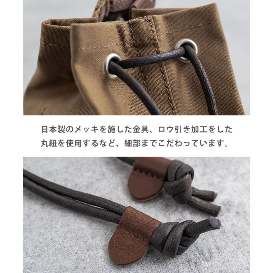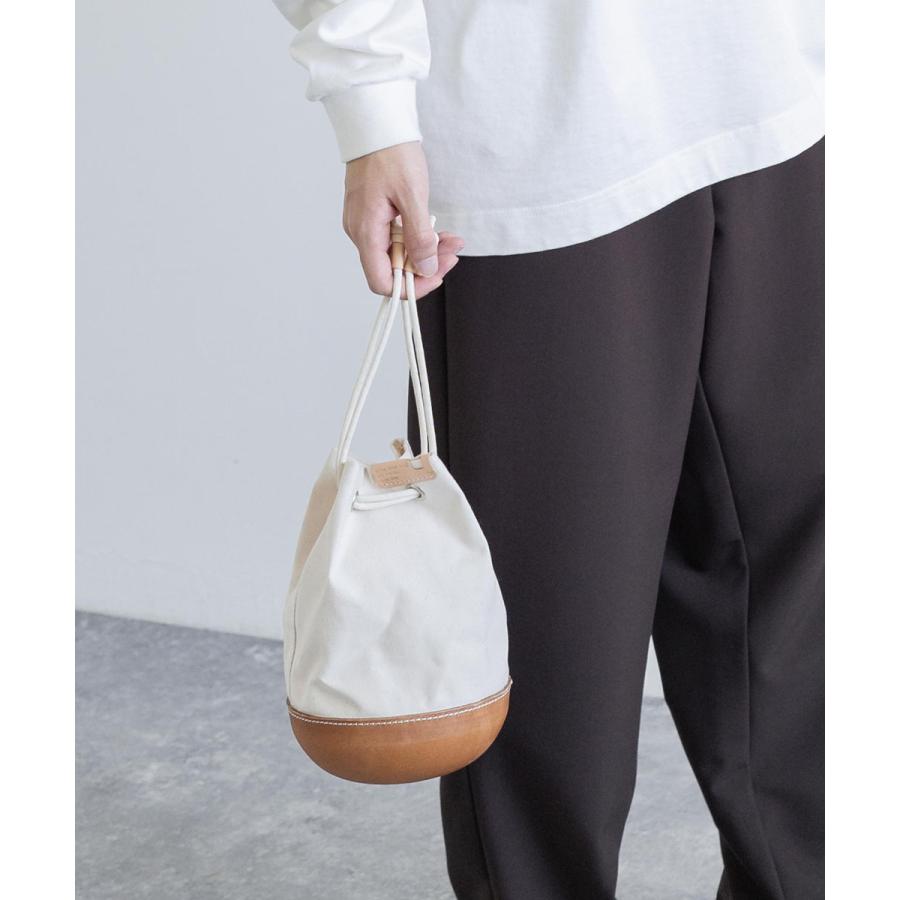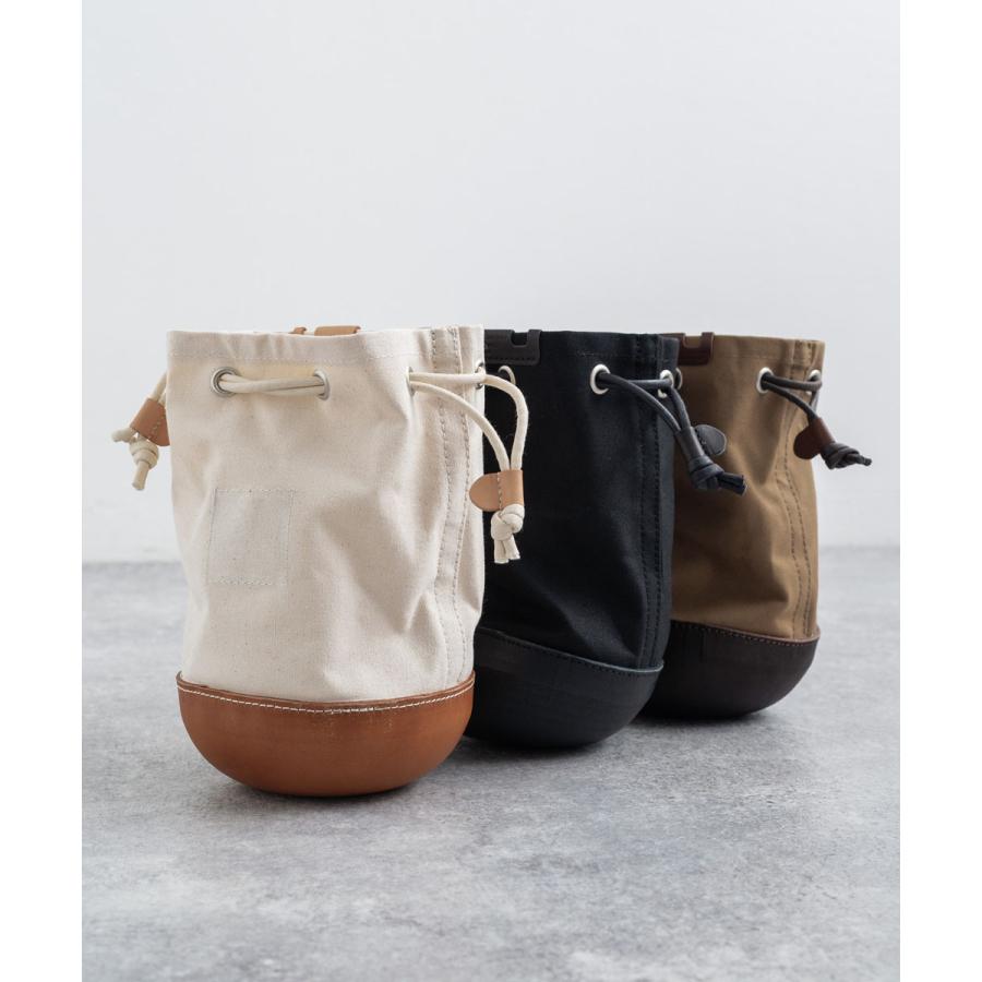 ユニークなデザインが目を惹くモールドレザー日本製パラフィンキャンバス巾着バッグ。