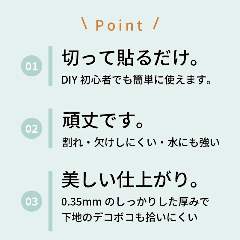 ・強力な粘着力があり、耐水性・耐久性に優れています。紙製や天然素材(突板)のテープは使用していくうちに摩耗しますが、こちらは樹脂製品の為、割れ・欠け・水の吸収がなく丈夫で長持ちします。