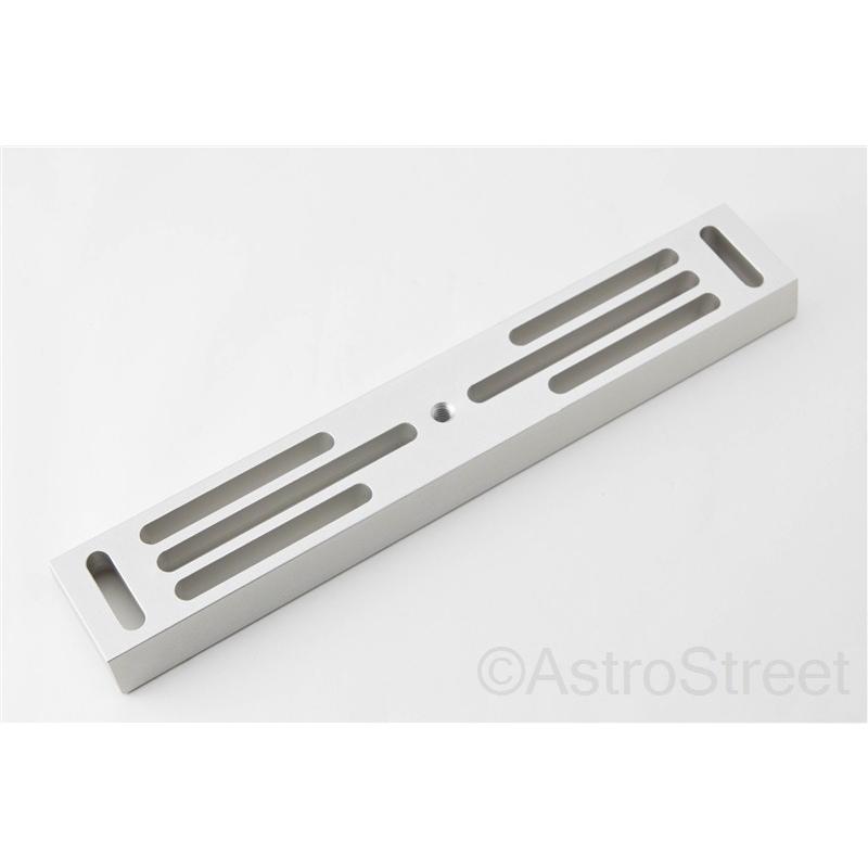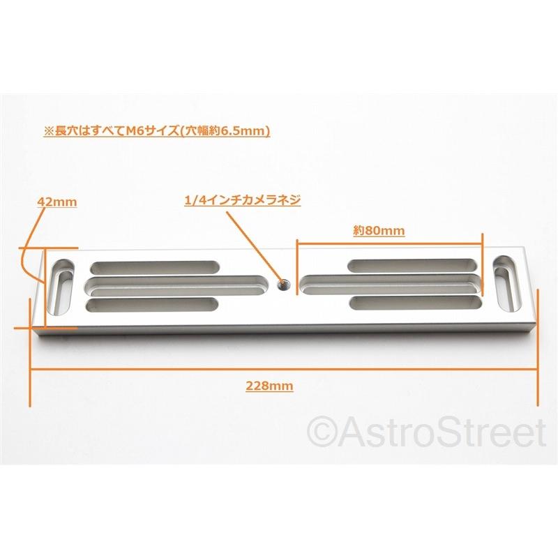 オリジナルの約23cm程のCNC加工アルミ削り出しのアリガタプレートです。<br><br><b>アリガタレールはビクセンのGP系ヘッドに適合します。<br>中央にはカメラねじ穴、中央から左右にそれぞれ約80mm,約60mm程の長さの長穴があります。約80mm長穴はザグリ加工されております<br>長穴幅は約6mmのバカ穴です。35mmM8に対応するバカ穴が左右それぞれに開けられております<br>アルミ削り出し、シルバーアルマイト処理で大変堅牢で高級感があります<br><br>※使用上問題の無いメッキムラ、当たりキズなどある場合もございますのでご了承ください<br>[重量]約230g</b>
