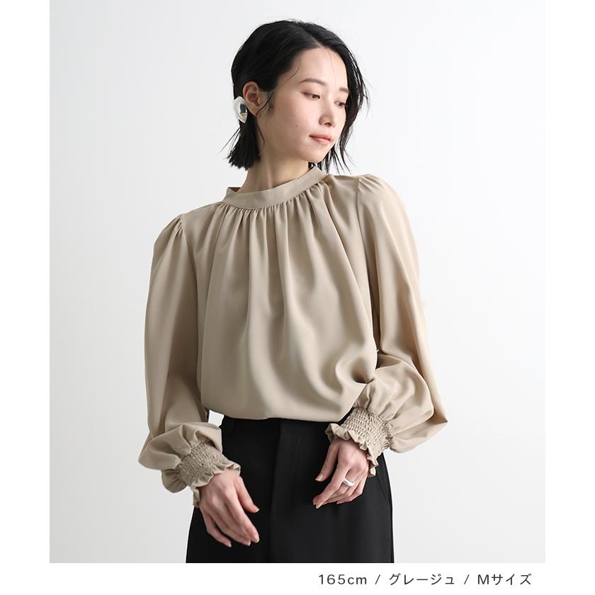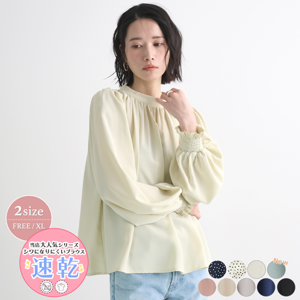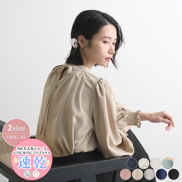 首後ろはリボンで結ぶタイプになっており、着脱ラクチン♪リボンの結び目はご自身で調節可能なのが嬉しいポイント★着ていて首元が苦しい…という心配や屈んだ時にインナーが見えてしまう心配もありません♪袖はふわっとしたバルーンスリーブになっていて女性らしさもあるデザイン☆長すぎない着丈と主張しすぎないデザイン性で合わせるアイテムや系統問わず合わせやすいブラウスです。ややハリ感のある生地で【シワにもなりにくく】【速乾性あり】