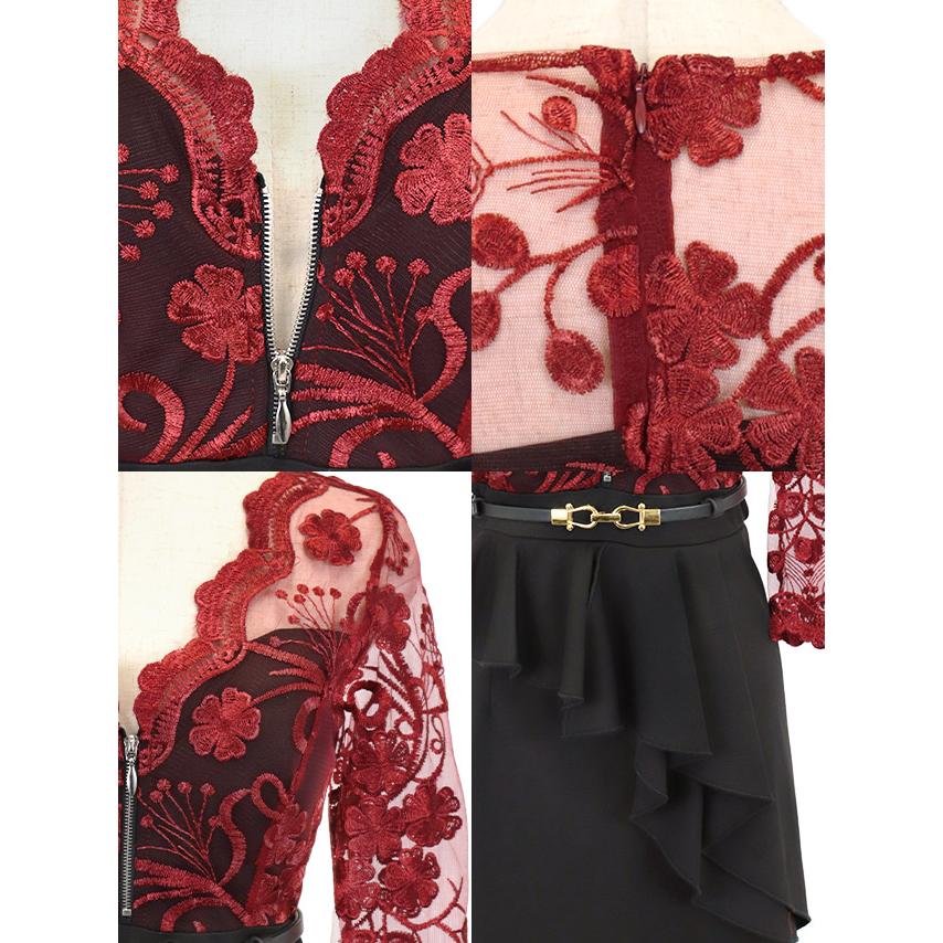 キャバ ドレス 刺繍 レース 花柄 ミニ ワンピース フリル セクシー ミニワンピース レッド ネイビー タイト ジップ ベルト ミニドレス キャバ嬢 キャバクラ 袖あり 大きいサイズ 七分袖 スナック キャバワンピ ラウンジ ミニワンピ レディース xl xxl