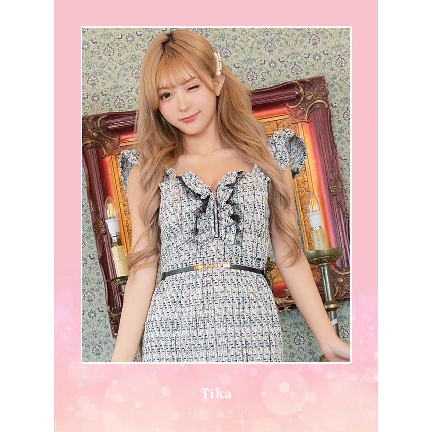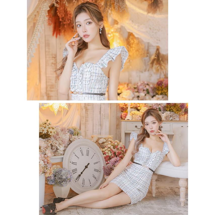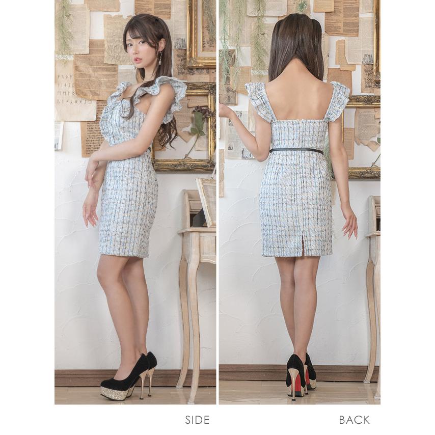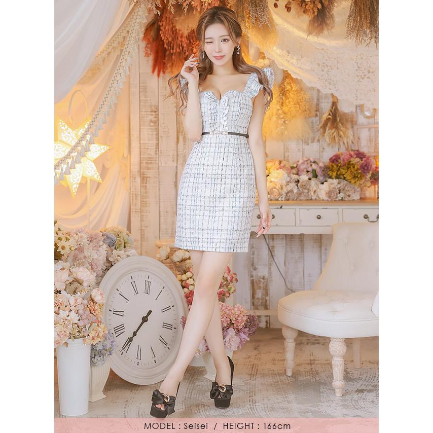 キャバ ドレス ツイード ベルト ミニ ワンピース フリル チュール チェック柄 タイト ミニワンピース 大きいサイズ 黒 白 青 ミニドレス キャバ嬢 キャバクラ ラウンジ スナック ガーリー ブラック ホワイト ブルー キャバワンピ 激安 即日発送 xl xxl
