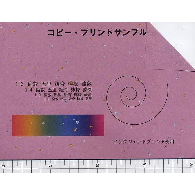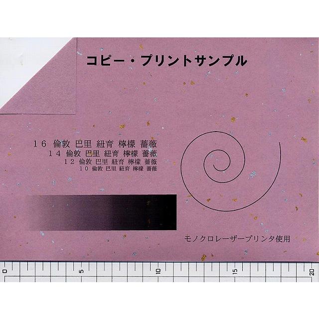 山藤色無地の和紙に金銀を散りばめました。日本伝統の色合いです。おめでたい席のちょっとした装飾などにもお使い頂けます。A4判(297×210mm)で10枚入りです。色:山藤色 裏面は色無地です。厚さ:70g/m2 普通のコピー用紙は64g/m2です。 注)同じ坪量(米坪)でも密度や原料が異なれば実際の厚さ(一枚のμm表記の数値)も多少異なります。インクジェット・レーザープリンタでも使用可能です。