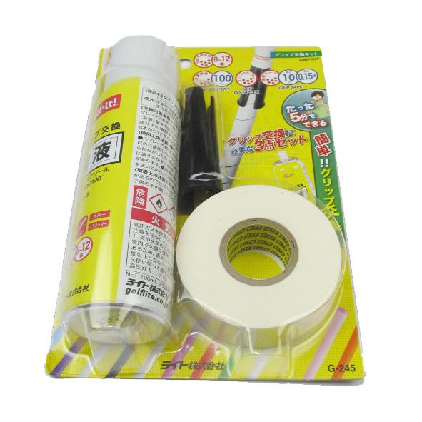 ●グリップ交換に必要な両面テープ(幅20mm×長さ10m)、エアゾールタイプ交換溶液(100mL)と太いシャフトや細いグリップを簡単に入れられるスターターがセットになっています。●台紙裏側に図解入りのグリップ交換説明があります。※使用中は火気と換気にご注意ください。スプレーは引火性があるので火気に近づけないで下さい。
