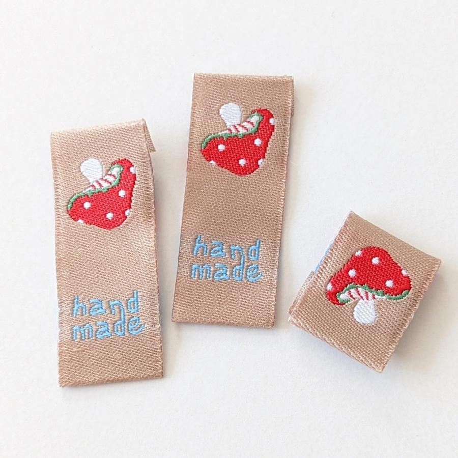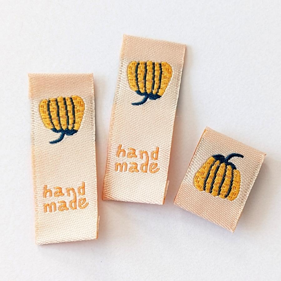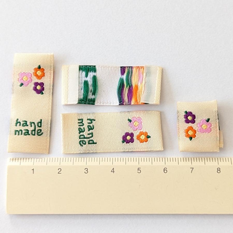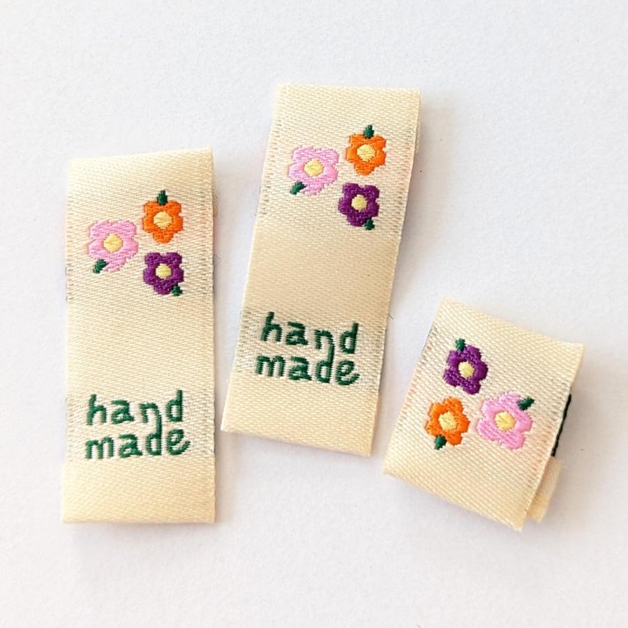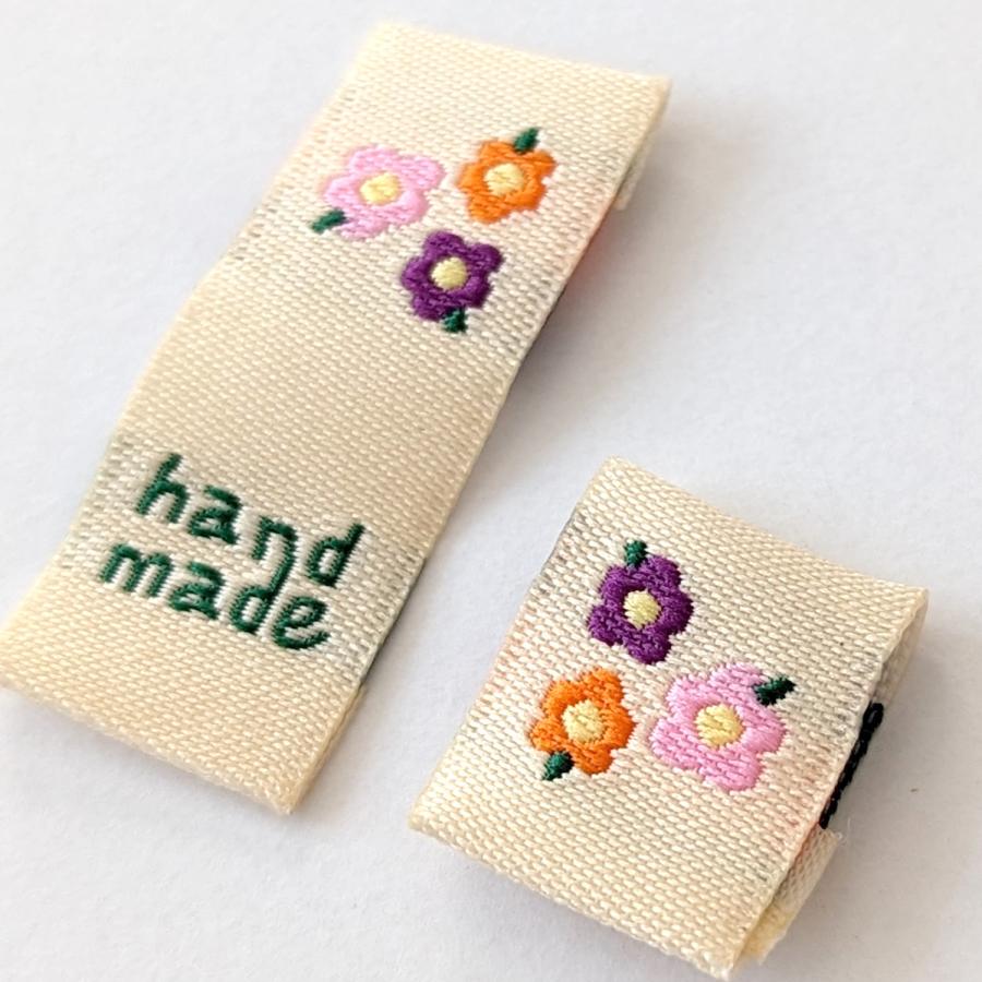 クリーム地に3色のお花と「handmade」の文字が刺繍された布タグ(折り込みタグ)18枚セットです。