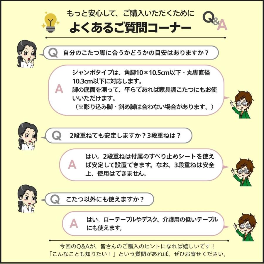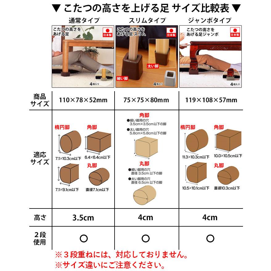 【商品説明】細い脚のこたつにぴったりのスリムタイプ!くつろぎ時に身体に当たりません! 脚の太さによって上・下の穴を使い分けられます。2段使用で更に高さを上げられます。(1段で4cmアップ、2段で8cmアップ)ローテーブルでも活用頂けます。【材質】PP樹脂 【耐荷重】100kg【商品サイズ/重量】 75×75×80mm/約62g 【付属品】すべり止めゴムシート/4枚 【カラー】ブラウン、ベージュ【個数】1袋4個入り【生産国】日本