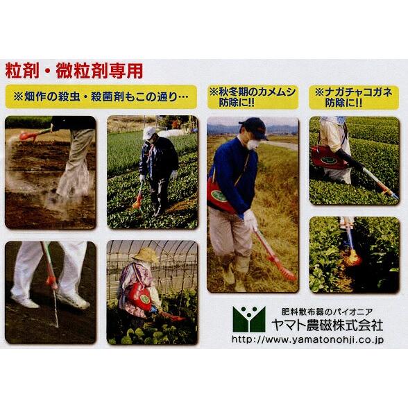 グリーンシャトルは農薬の全面散布、スジまきの1台2役!10haあたり1から3kgの農薬を均一に散布できます(1キロ剤対応型)例/カソロン粒剤6.7を1袋(3kg入)で幅1mの畦畔を500m散布できます。タスキ掛式のため作業性、安全性が格段に向上、畑作の殺虫・殺菌剤(粒状)も散布可能です。重量:0.9kg 容量:6〜7kg 散布幅:6〜7m