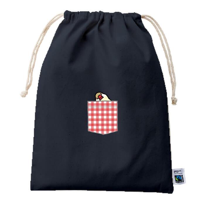 文鳥 巾着 フェアトレード コットン Lサイズ ポケット風 ひょっこり文鳥 赤チェック バッグ 小物入れ 通勤 通学 ポーチ かわいい プレゼント 男の子 女の子