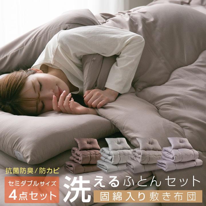 布団セット セミダブル 洗える 固綿入り敷き布団 掛け布団 枕 収納袋付き 抗菌 防臭 防カビ 布団 寝具 洗濯OK ふとんセット 4点セット 来客用 客用布団