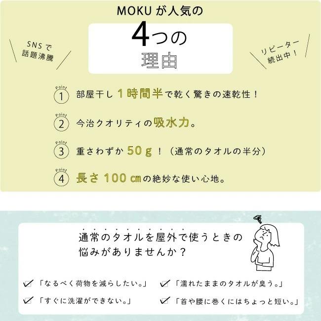 旅行や銭湯など、すぐに洗濯ができない場所で困るのが乾かないタオル。 MOKUは通気性に優れる細番手の糸とコンテックス独自の織技法で、季節によっては部屋干しで1時間半ほどで乾いてしまう速乾性を実現しました。
