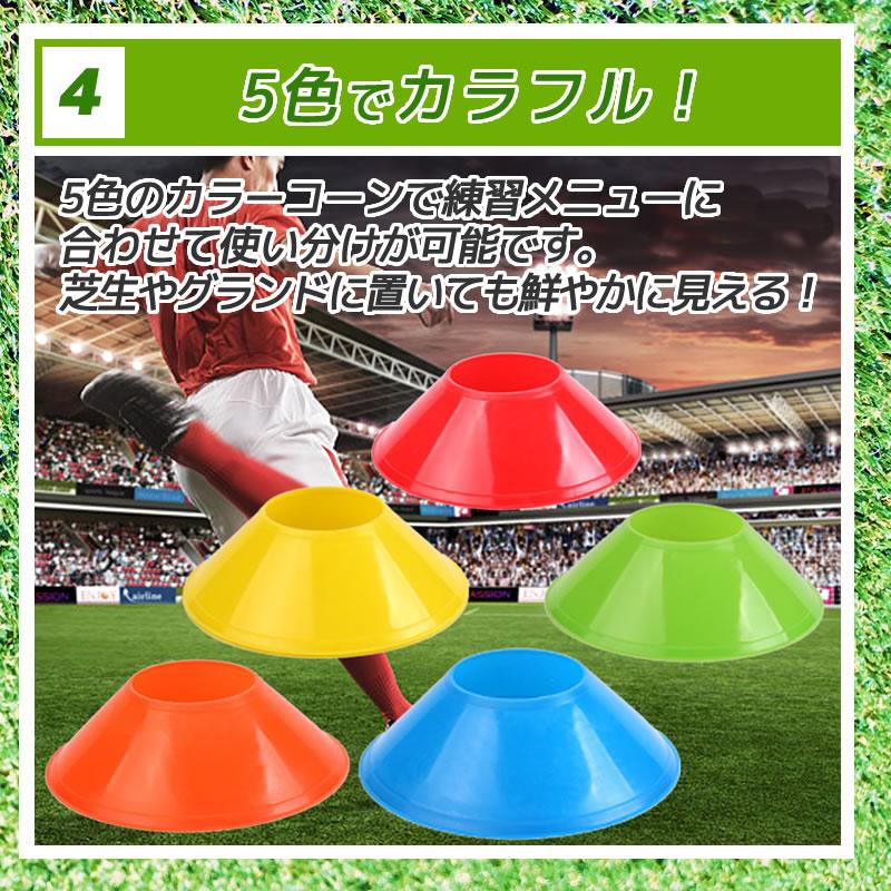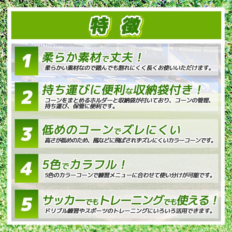5色のカラーコーンで練習メニューに合わせて使い分けが可能です。