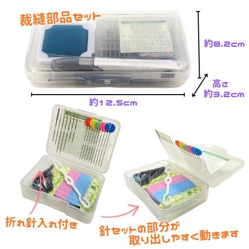 ◇ミニケース部品セット{ぬい糸、針セット付ケース(折針入れ付)、ひも通し、スレーダー(糸通し)、ひも通し、指ぬき、名前シール、さびどめ紙}