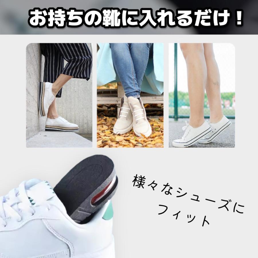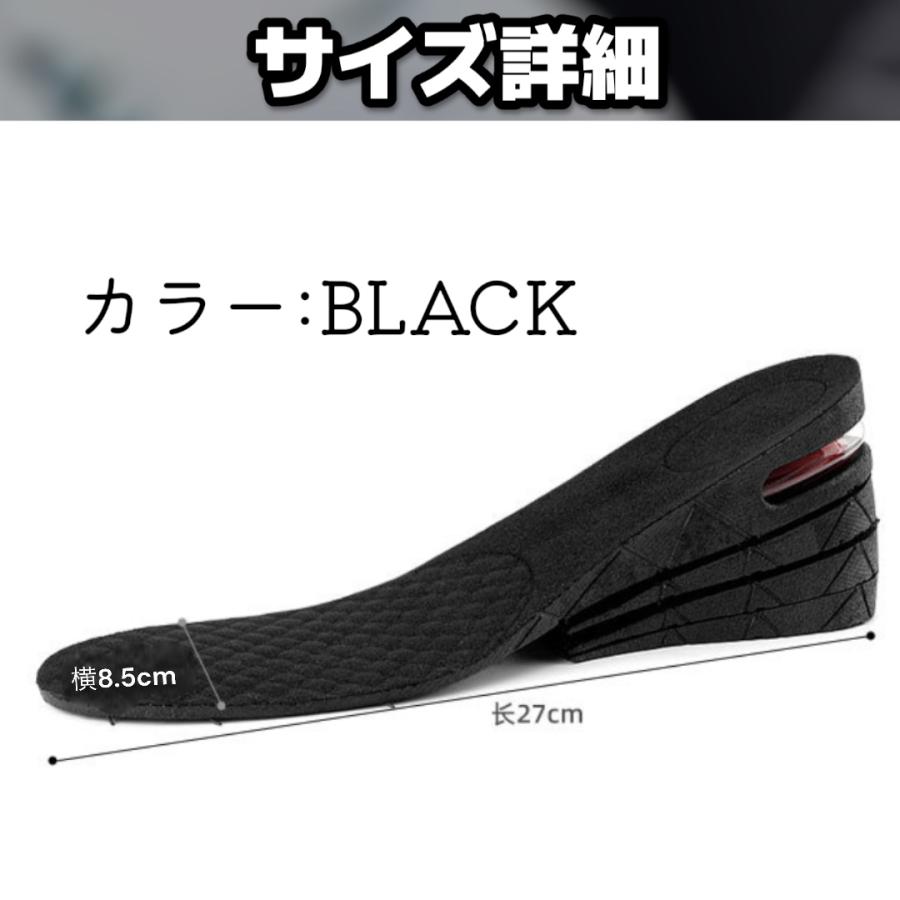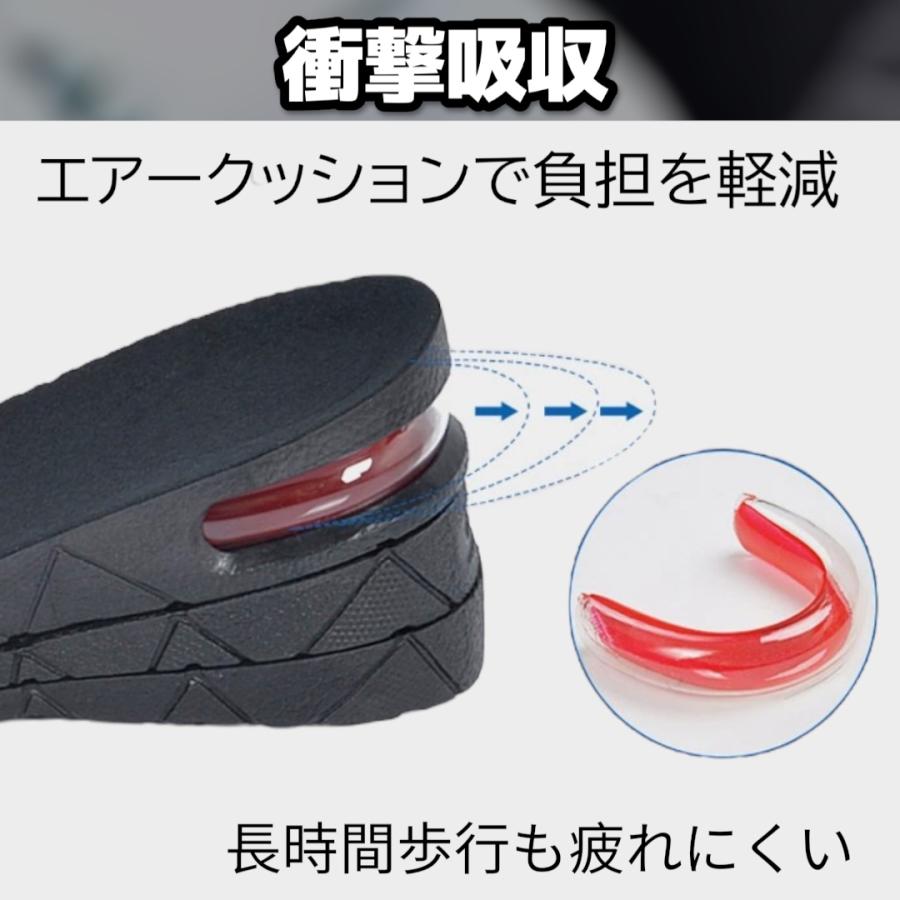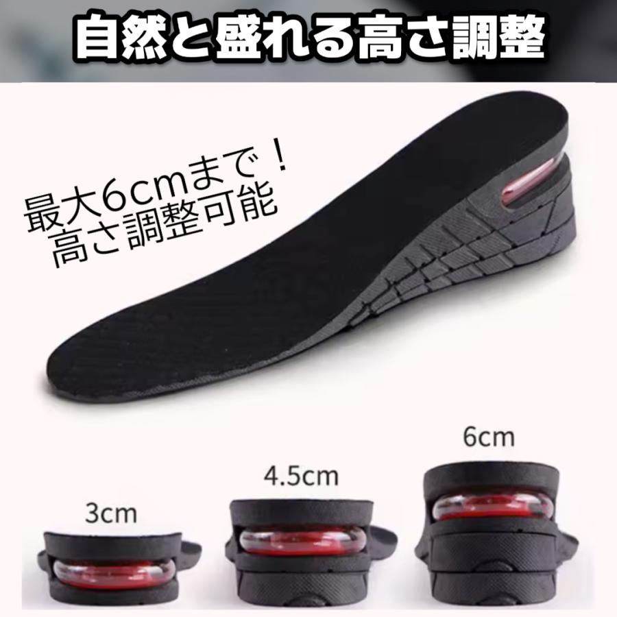 最大6cmアップで自然に盛れるシークレットインソールです。<br>3段階で高さ調整ができ、用途や靴に合わせて自由にカスタマイズ可能。<br>衝撃吸収構造のエアークッションが長時間の歩行をサポート。<br>通気性と軽量設計でムレにくく快適な履き心地。<br>抗菌防臭加工済みで毎日清潔に使用できます。<br>男女兼用フリーサイズ(約22.5〜27.5cm)。<br>ビジネスからカジュアルまで幅広く対応します。<br>左右セット(2枚入り)。