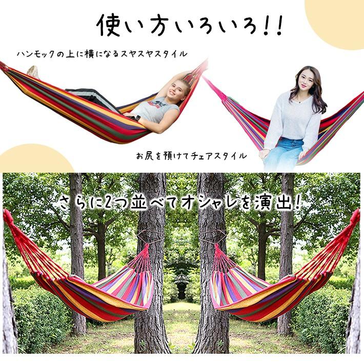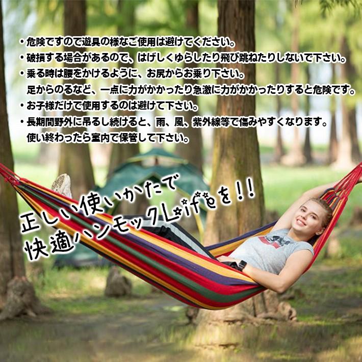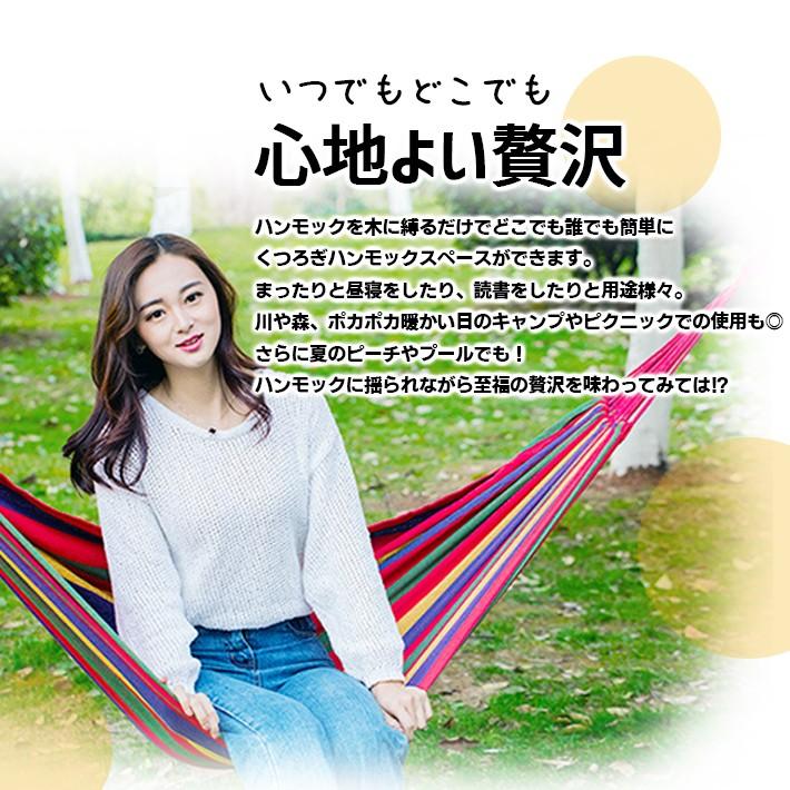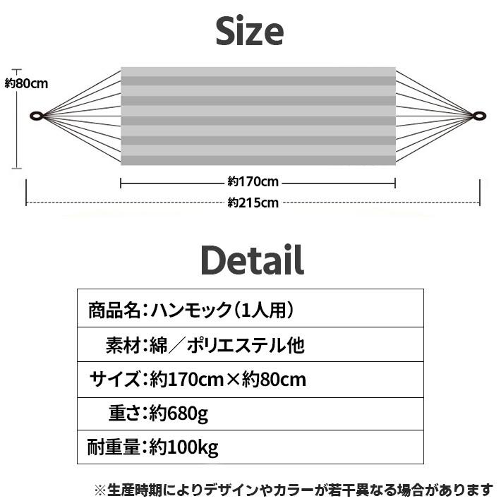 【商品概要】しっかりとした素材のハンモックです。屋外でも室内でも!【サイズ】サイズ:約170cm×約80cm【重さ】約680g【素材】綿/ポリエステル他【耐重量】約100kg