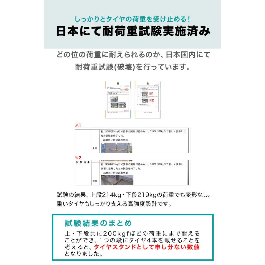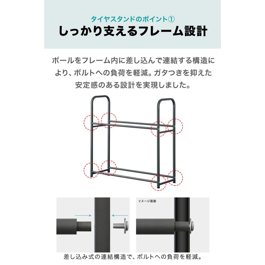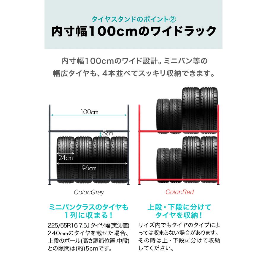 タイヤスタンドの幅は内寸100cmに設定。幅を広くすることで、ミニバンやワンボックスカーなどに使用される普通車より幅広タイプのタイヤでも4本1列におけるようになりました。