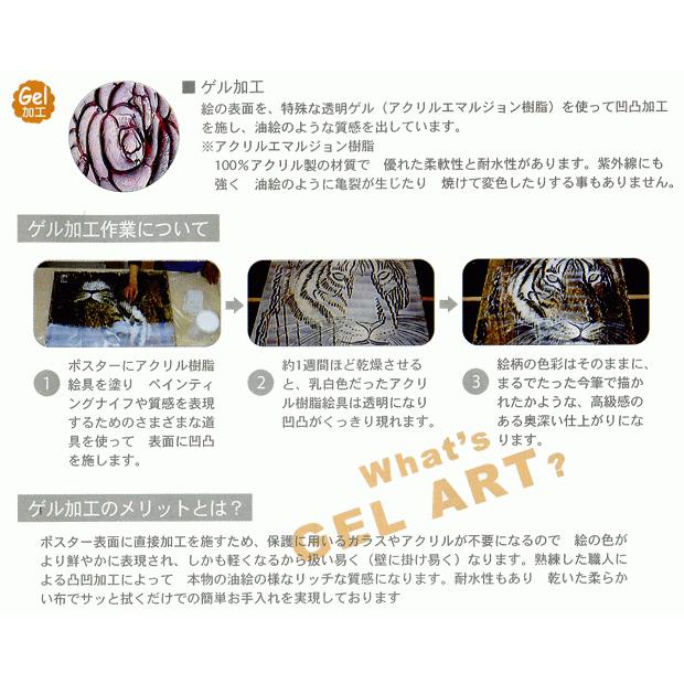 【ゲル加工】絵の表面を特殊な透明ゲルを使って、凹凸加工を施し、油絵のような質感を出しています。 保護に用いるガラスやアクリルが不要になるので、絵の色がより鮮やかに表現され、しかも軽くなるので扱いやすくなります。