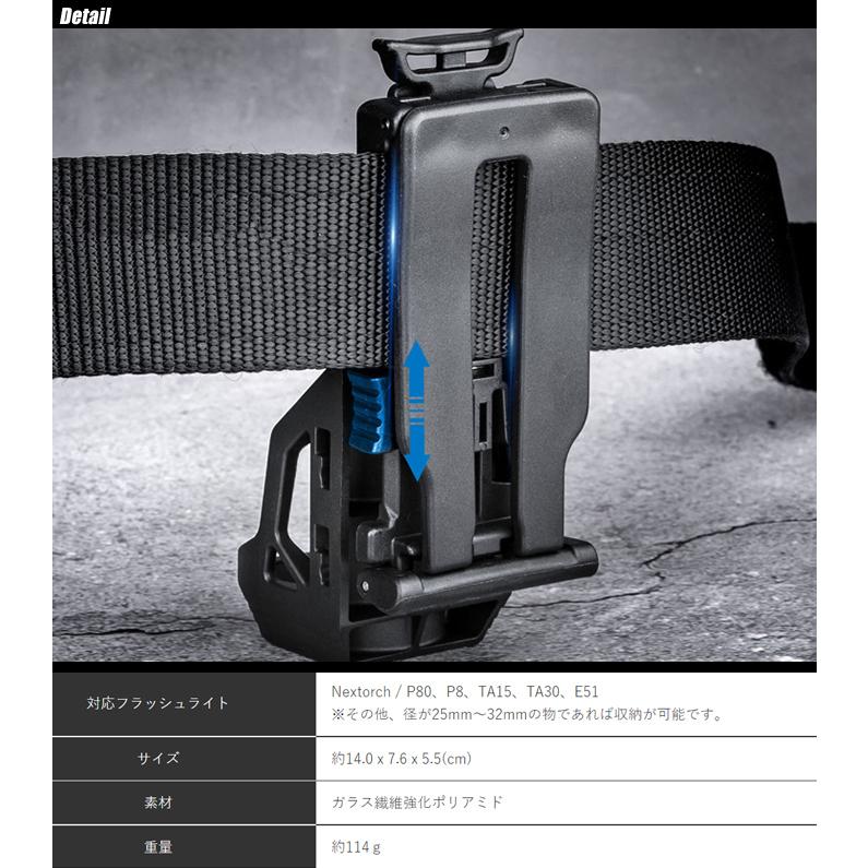 ボディの径25〜32mmフラッシュライト対応。片手でロックを操作し着脱することができます。ホルダー部分とベルトクリップ部分を分離させることも可能。幅調節機能を搭載した背面のベルトクリップはベルト幅55mmまで対応。角度を自在に調整し位置固定することができます。商品管理番号:nxt1405896カラー:ONECOLORサイズ:ONESIZE