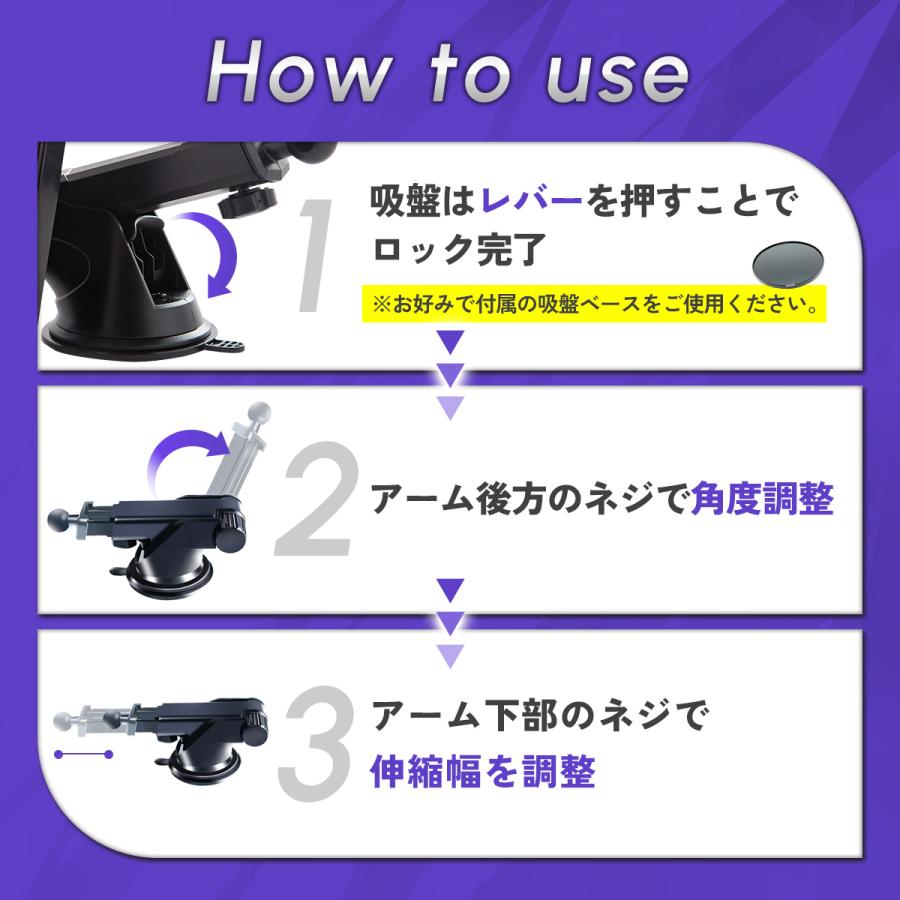 吸盤タイプなので、ダッシュボードやフロントガラス、助手席前などお好みの場所へ取り付けできます。
