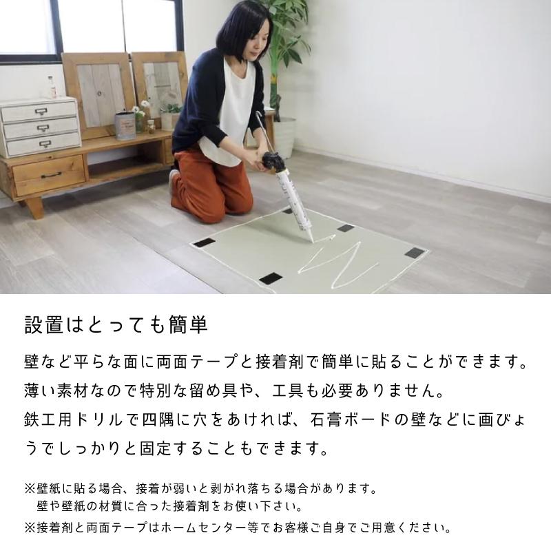 壁など平らな面に両面テープと接着剤で貼ることができます。薄い素材なので特別な留め具や、工具も必要ありません。