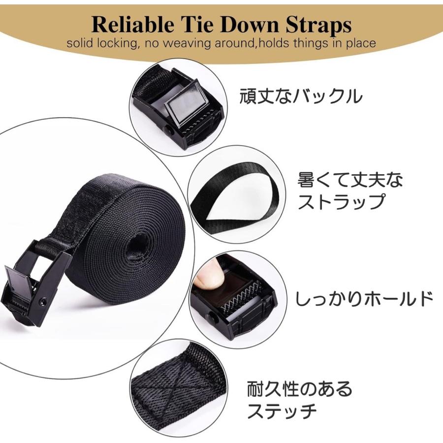 【使用方法】 (1)レバーを押し上げる (2)バックルの下側からベルトを通す (3)適した長さになるまで引く (4)レバーを戻し固定する ※緩めるときは再度、レバーを押し上げて下さい。【耐荷重】 ・200kg(破断荷重) ※安全上の理由により、使用荷重の推奨値は破断力の1/5(40kg)になります。【サイズ】 ・長さ:3m ・幅:25mm【カラー】 ・ブラック(黒)【材質】 ・ベルト:ナイロン ・バックル:亜鉛合金(電気泳動塗装※eコーティング)