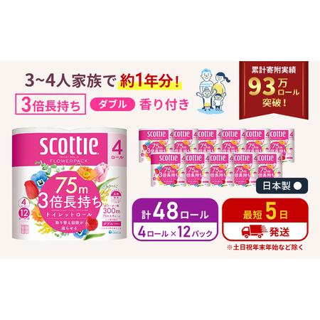 ■ 容量 スコッティフラワーパック3倍長持ち:ダブル 4ロール (75m×4ロール) 1ケース(12パック入り) ※くつろぎの花の香りつき パルプ 日本製 タイプ:【常温】