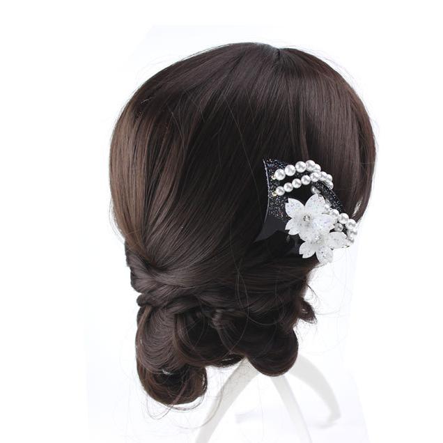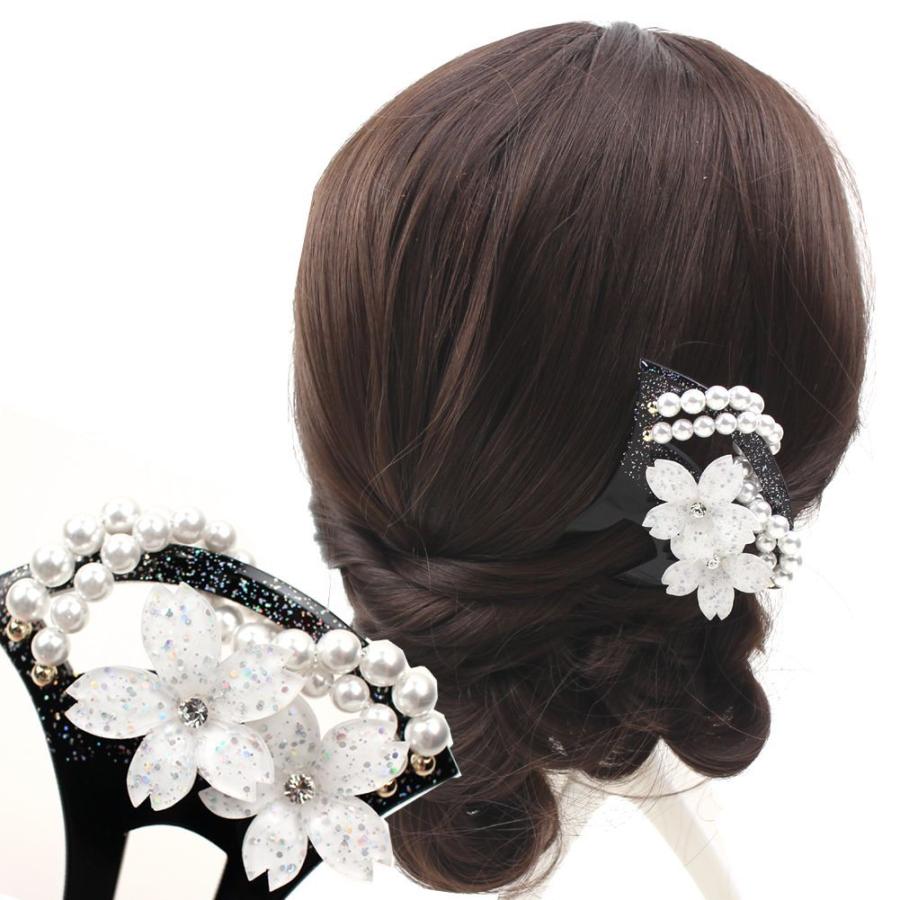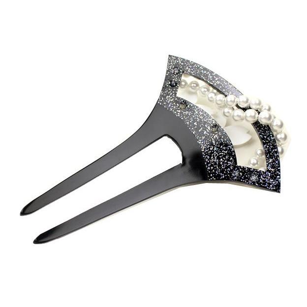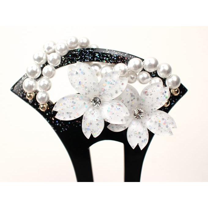 袴 卒業式 着物 入学式 ヘアアクセサリー ウェディング 髪飾り 留袖 結婚式 成人式 振袖 和装 黒色のバチ型の先端にパールビーズが2列巻きつくようにあしらわれた華やかな簪です。立体的なラメ桜の中央にはラインストーン一粒あしらわれゴージャスな雰囲気です。簪の土台部分にも細かなラメが先端に施されています。パーティーなど華やかなシーンにお勧めの簪です。幅8.7cm×長さ13cm