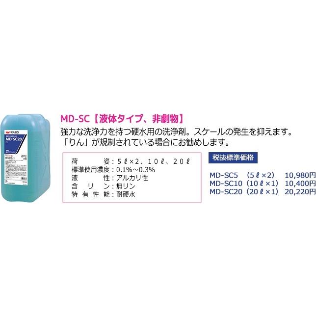メーカー:マルゼン(シーバイエス株式会社から出荷)商品名:MD-SC10 食器洗浄機用洗剤 液体タイプ 非劇物管理コード:T41467内容:10L●強力な洗浄力を持つ硬水用の洗浄剤。スケールの発生を抑えます。●「りん」が規制されている場合にお勧めします。標準使用濃度:0.1〜0.3%備考:液体タイプ 非劇物 無りん アルカリ性 耐硬水