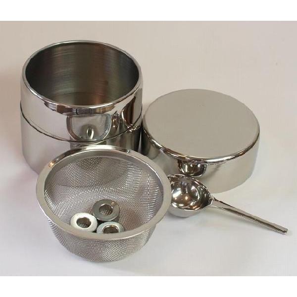 抹茶を入れて蓋をして横に振るだけ。 素速く抹茶を篩うことが出来ます。家庭用小サイズで新発売、一度に15g程度です。ステンレス製で痛むものがないので半永久的にご使用頂けます。 今まで網の上でこすり落としてイライラして篩っていたのがウソのよう。自信を持っておすすめします。