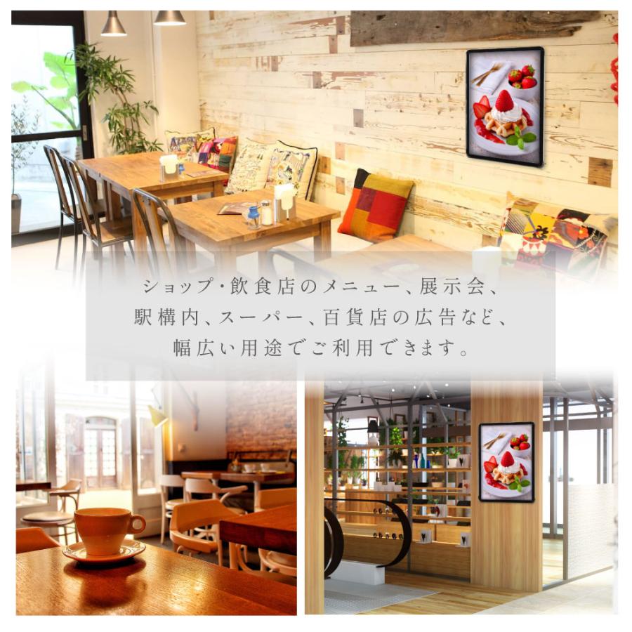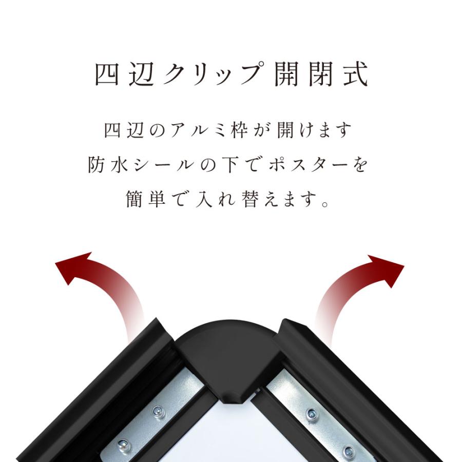 前四辺が開けられるため、壁につけたままでも、掲示物の入れ替えが可能!掲示物を頻繁に入れ替える必要がある場所でのご利用に最適。フレームは、安全配慮で四隅を丸くしたスリムタイプです。駅、ホテル、公共施設、や金融機関、飲食店などの商業施設でご好評をいただいております。<br>※取り付けする金具、器具はお客様ご自身でご用意いただきます。