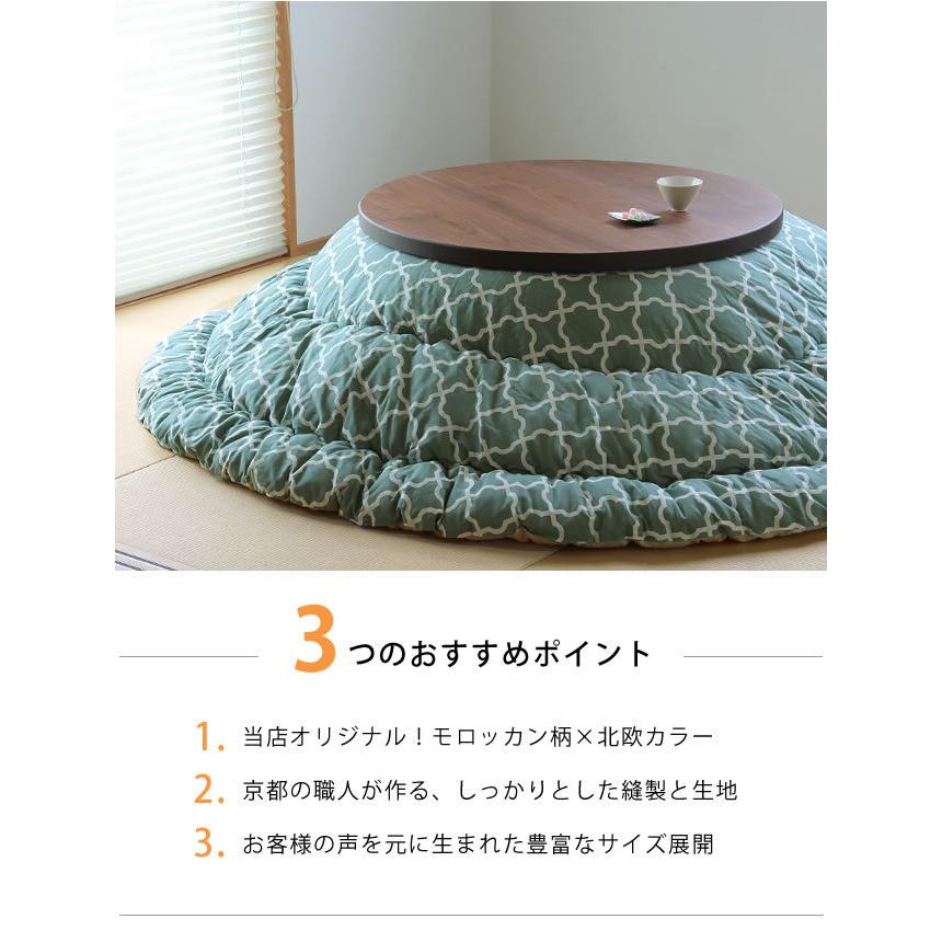 [国産]和風にも洋風にもぴったり!当店オリジナルこたつ布団。京都の職人さんが作る、しっかりとした縫製とこだわりの生地。お客様の声を元に、サイズ展開を豊富に取り揃えました。おしゃれな北欧柄とカラー展開がお部屋のワンポイントになります。【ftan_all】 【ftan_atsu】 【ken_all】 【kf_org01】 【original_046】 【サスティナブル商品】【original_atumrk】コタツ布団 北欧 おしゃれ 国産 北欧テイスト モダン シック 上品 ふっくら 超大判 円形 ボリュームこたつ布団 コタツ布団 国産 良品 おしゃれ オシャレ 節電 エコ 節約 丸 大判 大きい 大型 丸型 円形 日本 日本製 冬物 和室 洋室 リビング 和モダン ジャパニーズ 布団 ふとん 省エネ コットン 綿 ふっくら 厚掛け オリジナル グリーン ブルー アイボリー イエロー ベージュ 北欧 北欧テイスト 北欧風 モロッカン マラケシュ モロッカンインテリア ジャパンディ Japandi 【Sales_OK】