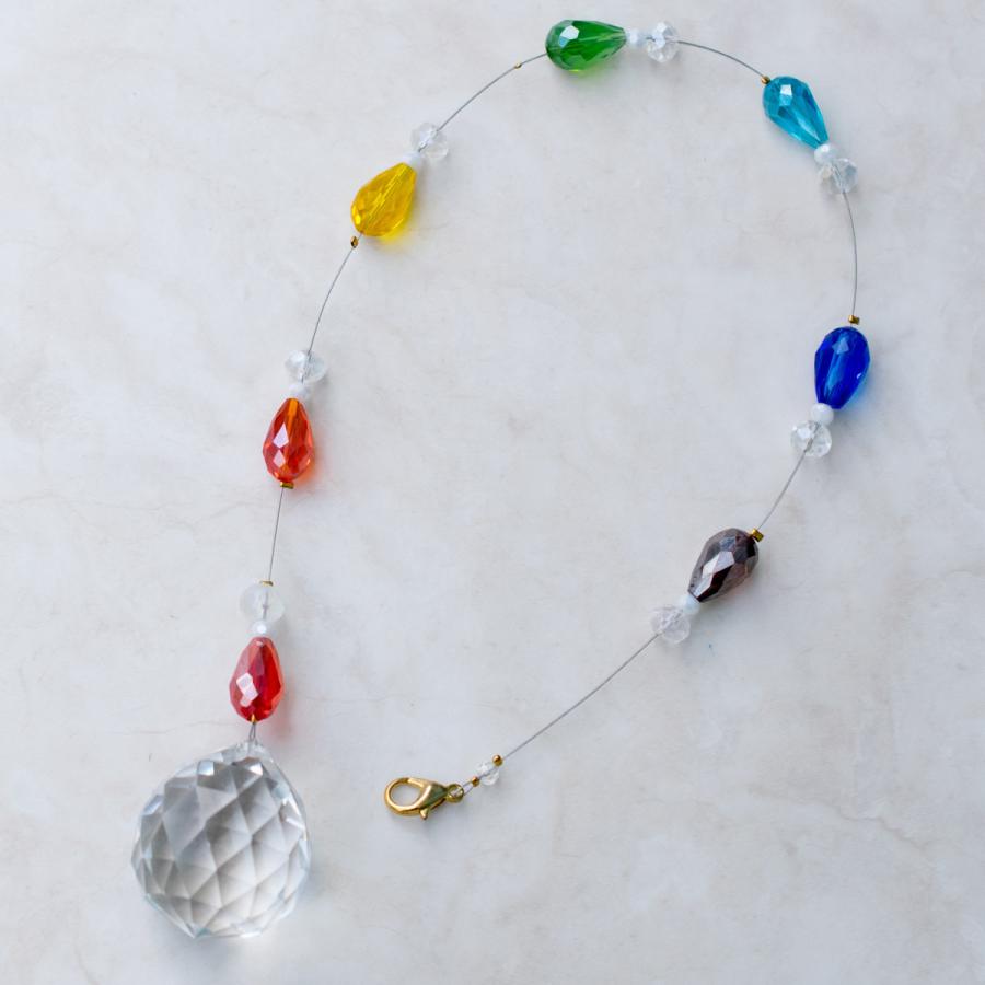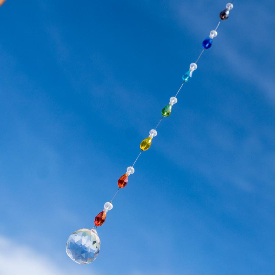 太陽の光が当たる窓際に吊り下げることで、太陽光がプリズムのように分光して、小さな虹の光がたくさんあふれます。