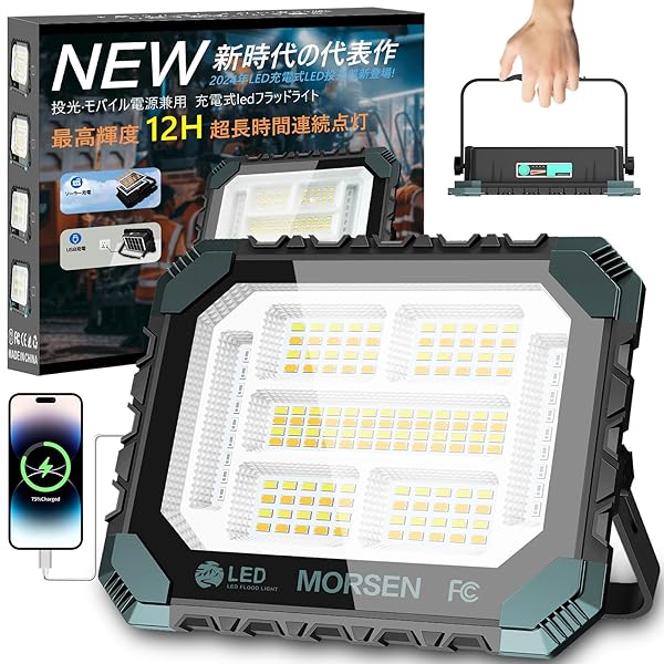 【100%明るさ超長時間12時間運転点灯】MORSEN 投光器 充電式 led 作業灯 200W 16000LM 屋外 超高輝 16000mAH大容量 ワークライト IP66防水 5つ点灯モード 便携式 太陽光発電 磁気設計 キャンプ アウトドア 登
