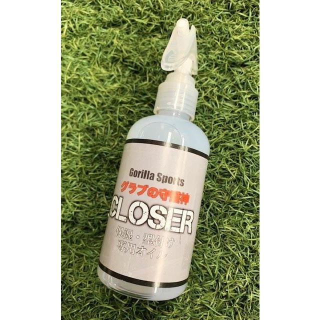 グラブ型付け職人が生み出した保湿専用オイル。・汚れ落とし後の保湿に・型付け後の保湿に・革がカサついた時の保湿に・雨でグラブが濡れてしまった時の保湿に使用方法1.砂や汚れを落とすべし2.クローザーをよく振って吹きかけるべし3.ブラッシングをすべし●主成分:保湿剤・乳化剤・防腐剤●容量:200ml