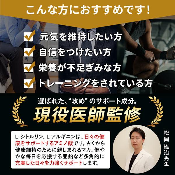 【業界屈指の66,000mg配合】 シトルリン 39,000mg / アルギニン 27,000mg / 亜鉛 450mg、さらに、マカ、黒生姜(クラチャイダム)、牡蠣エキス、スッポン、高麗人参など全12種の厳選ハイクラス成分を圧倒的な配合量を誇る医師監修の日本製エナジーサプリメント。