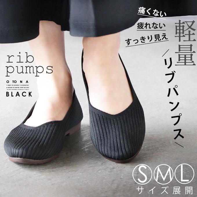 靴 パンプス レディース ブラック フラットシューズ ぺたんこ 歩きやすい 痛くない 柔らかい ローヒール 低反発ソール 軽量 リブパンプス OTONA 40代 50代 60代