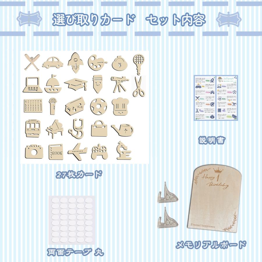 【セット内容】:「選び取りカード」*27枚、「説明書」*1枚、「メモリアルボード」*1枚、「カードスタンド」*2個、「両面テープ」*1枚。