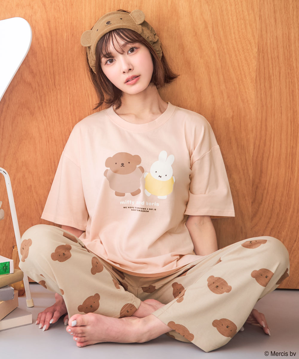 2025年はミッフィー誕生70周年!ラテカラーが可愛いミッフィーの、トップス・ボトムス・ヘアバンドが付いた豪華な3点セットルームウェアが登場しました。トップスのフロントには愛らしく横並びになったミッフィー&ボリスとミッフィー&メラニー、総柄のロングパンツにはミッフィーもしくはボリスのチャーミングなお顔がプリントされています。Tシャツは肘の長さまで袖がある半袖タイプ、ボトムスはロング丈でウエストがドローストリング仕様になっています。コットン混の柔らかな肌触りが着心地の良い上下セットです。セットで使うとよりキュートな着こなしになるパイル地のヘアバンド付き!ドロップショルダーでゆったりとした抜け感のある着こなしは、リラックスしたいおうち時間にぴったり。ミッフィーが大好きなご家族やお友達へのプレゼントにもおすすめです。