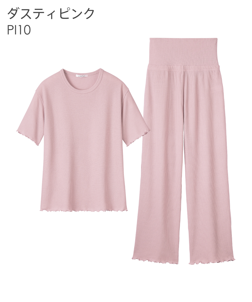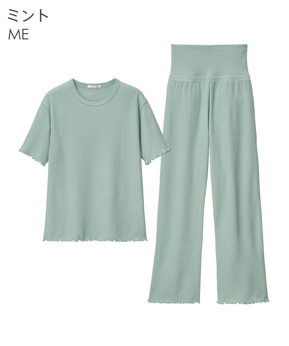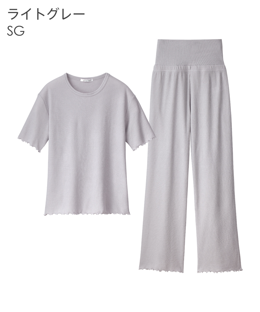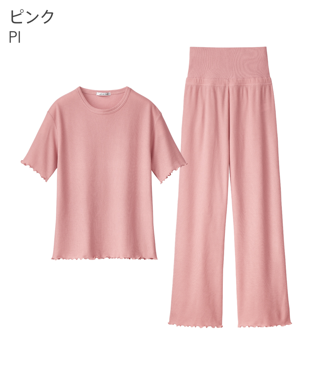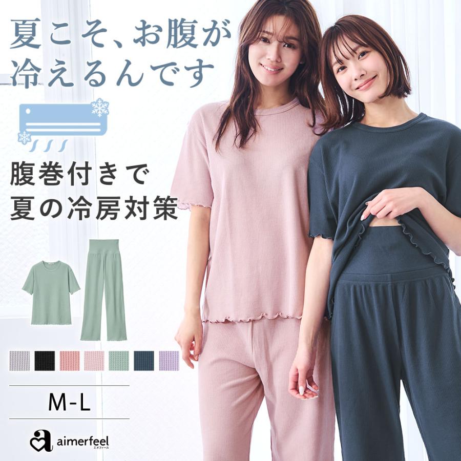 SNSでバズった大人気の腹巻付きルームウェアが夏バージョンになって登場しました!薄手でさらっと着られるサマーワッフル素材の半袖とロングパンツの上下セットです。ボトムスのウエスト部分は腹巻きみたいにおなかが隠れる一体型。締め付け感のない長めのリブがお腹をすっぽり包み込んでくれて、クーラー冷えが気になる季節にぴったりの夏用の温活ルームウェアです。袖口と裾にはメロウフリルをほどこして、女性らしさをプラス。二の腕をカバーしてくれる安心の袖丈がうれしいポイントです。おしゃれで大人可愛いカラー展開で、リラックスタイムやパジャマにもピッタリ。