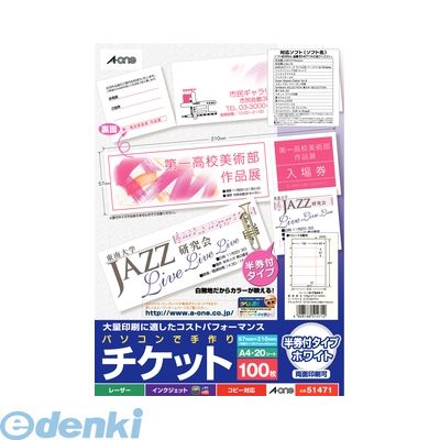 エーワン パソコンで手作りチケット 5面半券付 ホワイト A-one 51471 返品種別A
