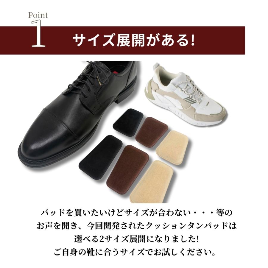 甲部分が靴に当たって痛い・・・サイズが合わない靴を買ってしまいすぐ脱げる・・・そんな方に使っていただきたいのがクッションタンパッド!カラーは3色、サイズも選べて高級感のあるスエード生地の触り心地もGOOD!是非お試しください。素材 起毛タイプ:合成繊維注意事項 ■本製品をご使用になり、万が一痛みを感じた場合は、ご使用をおやめください。■本製品を靴から剥がした場合、靴に粘着剤が残る可能性がございます。