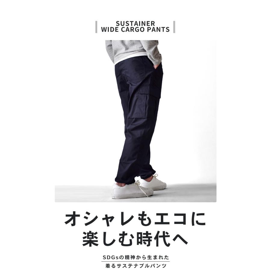 通常であれば焼却破棄される残反を活用し、新しく生まれ変わったカーゴパンツ。ワイドシルエット、テーパードライン。裾口はヒモ付き。Tシャツやスウェットなどトップスとの相性も良くオールシーズン活躍するアイテム。素材綿60%ポリエステル40%備考写真モデルは身長175cm体重63kgで、Mサイズを着用しています。※こちらの商品は1点までのご注文の場合、ゆうパケットで発送させて頂きます。お届け日時はご指定頂けません。複数点購入・代引決済のご注文は宅配便での発送となります。