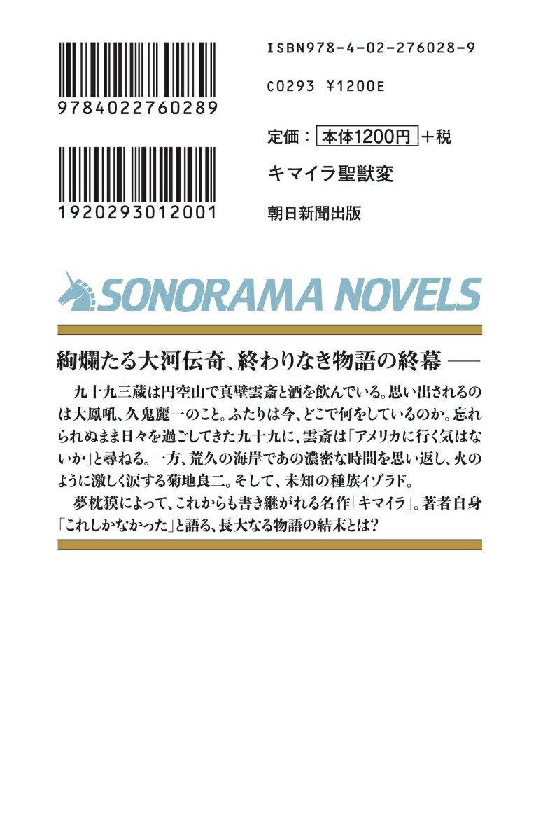 絢爛たる大河伝奇、終わりなき物語の終幕ー九十九三蔵は円空山で真壁雲斎と酒を飲んでいる。思い出されるのは大鳳吼、久鬼麗一のこと。ふたりは今、どこで何をしているのか。忘れられぬまま日々を過ごしてきた九十九に、雲斎は「アメリカに行く気はないか」と尋ねる。一方、荒久の海岸であの濃密な時間を思い返し、火のように激しく涙する菊地良二。そして、未知の種族イゾラド。夢枕獏によって、これからも書き継がれる名作「キマイラ」。著者自身「これしかなかった」と語る、長大なる物語の結末とは?