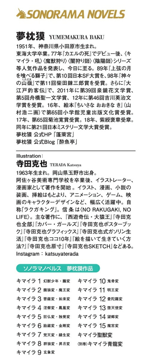 夢枕獏(ユメマクラバク)1951年、神奈川県小田原市生まれ。東海大学卒業。77年『カエルの死』でデビュー後、〈キマイラ・吼〉〈魔獣狩り〉〈闇狩り師〉〈陰陽師〉シリーズ等人気作品を発表し、今日に至る。89年『上弦の月を喰べる獅子』で、第10回日本SF大賞を、98年『神々の山嶺』で第11回柴田錬三郎賞を受賞。さらに『大江戸釣客伝』で、2011年に第39回泉鏡花文学賞、第5回舟橋聖一文学賞、12年に第46回吉川英治文学賞を受賞。16年、絵本『ちいさなおおきなき』(山村浩二画)で第65回小学館児童出版文化賞受賞。17年、第65回菊池寛賞受賞。18年、紫綬褒章受章。同年に第21回日本ミステリー文学大賞受賞(本データはこの書籍が刊行された当時に掲載されていたものです)